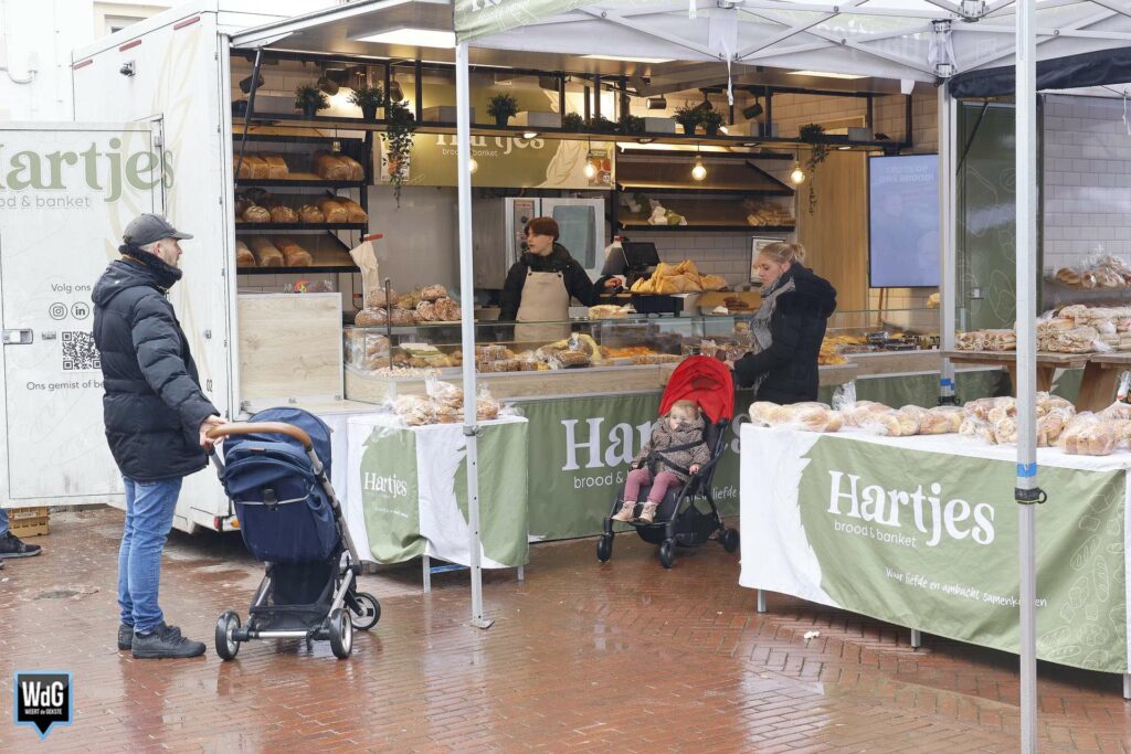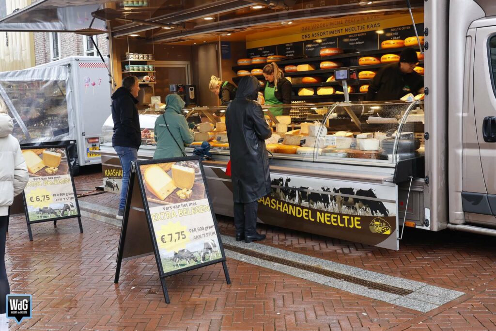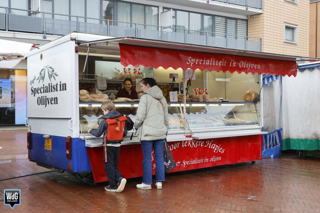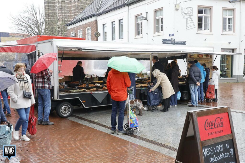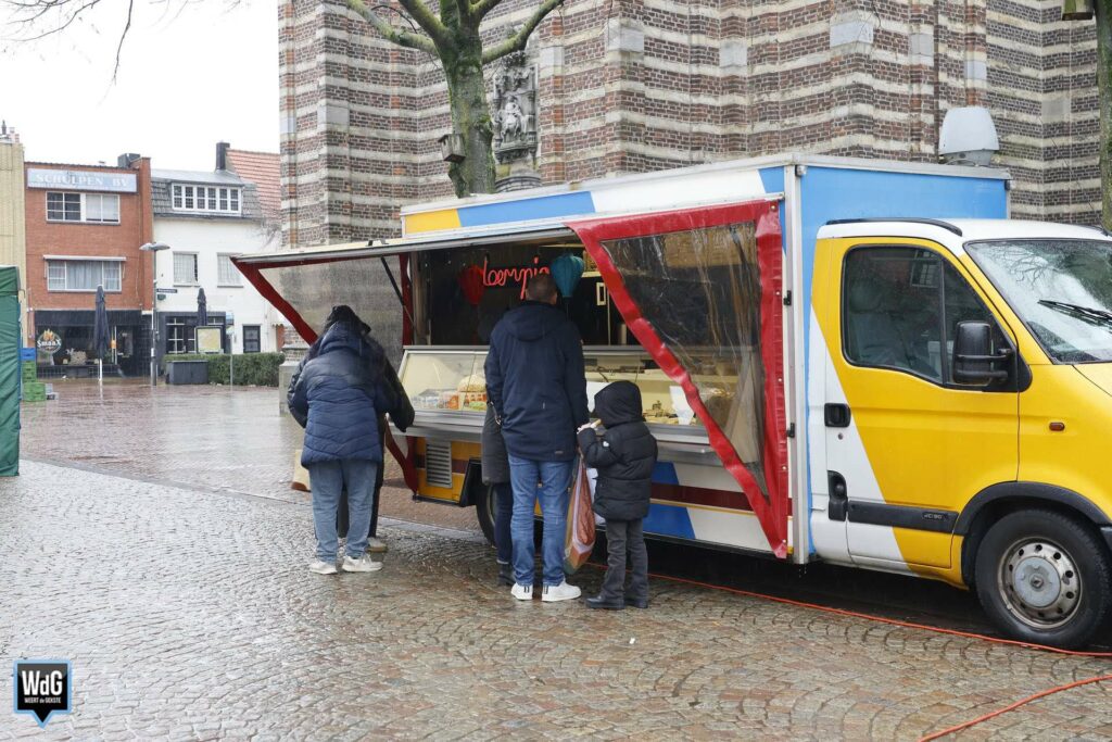 En met dit weer heeft de markt ook zo zijn charme. Een portie warme kibbeling of een loempia smaakt immers nét wat beter wanneer het buiten koud en nat is. Ondanks de regen was er dus toch nog wat leven te zien tussen de marktkramen.
