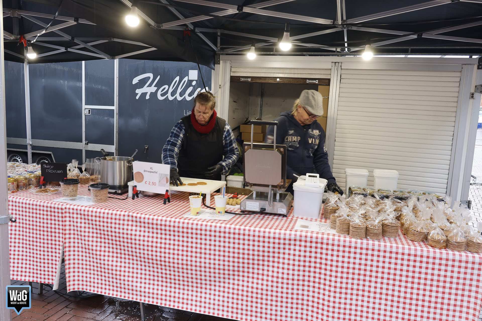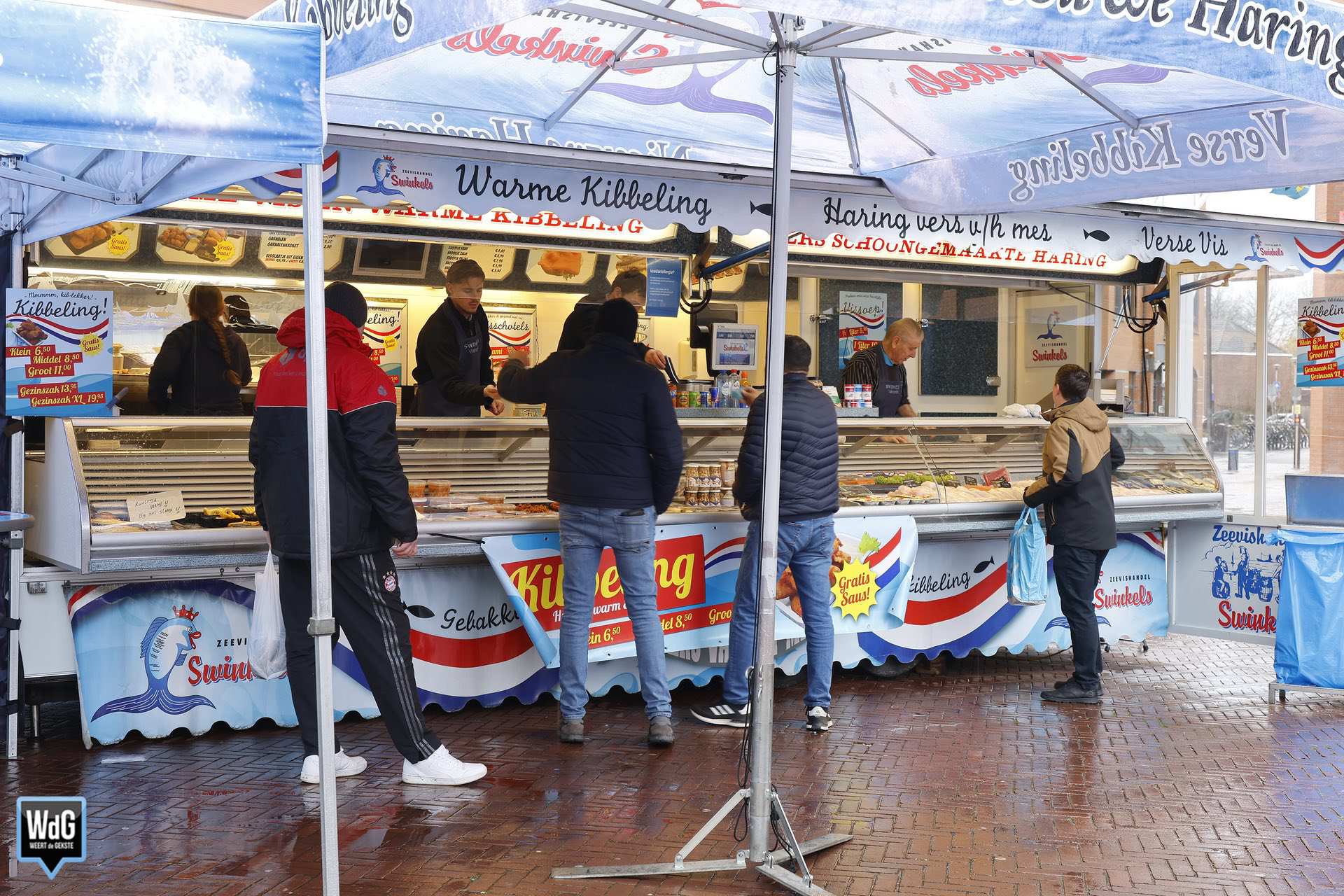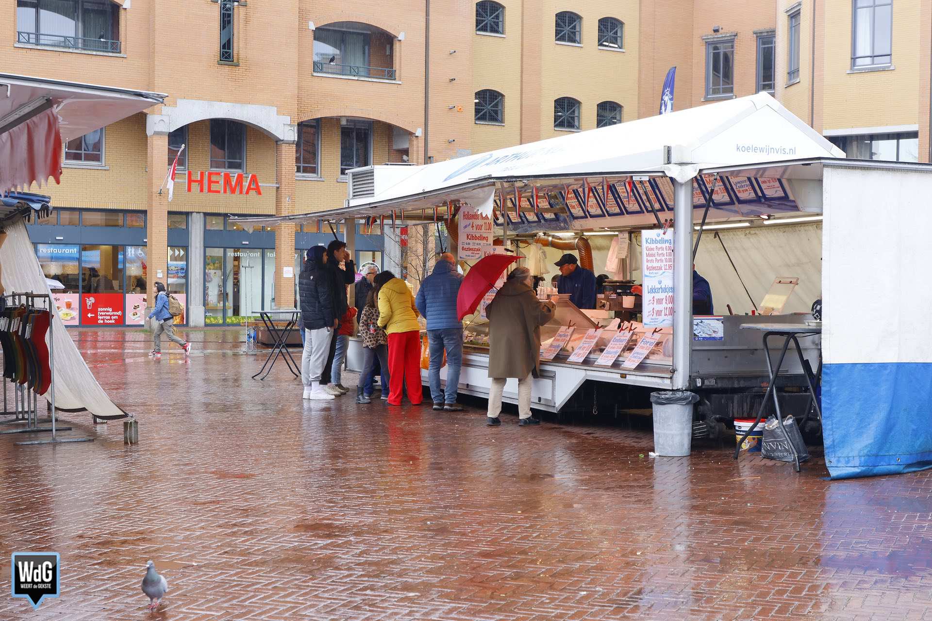En met dit weer heeft de markt ook zo zijn charme. Een portie warme kibbeling of een loempia smaakt immers nét wat beter wanneer het buiten koud en nat is. Ondanks de regen was er dus toch nog wat leven te zien tussen de marktkramen.