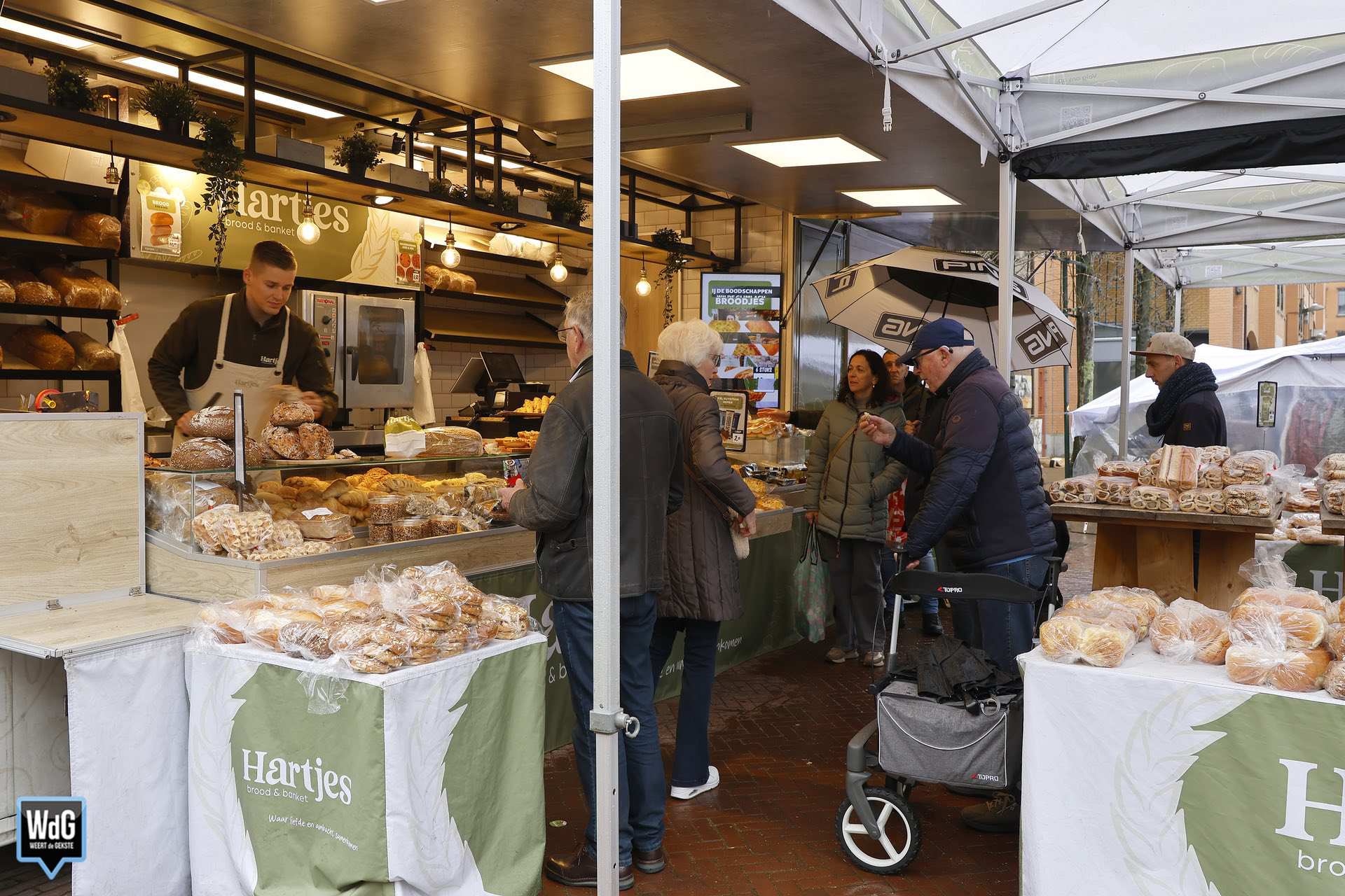 Toch lieten niet alle bezoekers zich tegenhouden door de regen. Her en der liepen mensen met een paraplu over de markt om hun boodschappen te doen. Vooral bij de kramen met brood, bloemen en andere verse producten stonden nog wat klanten.