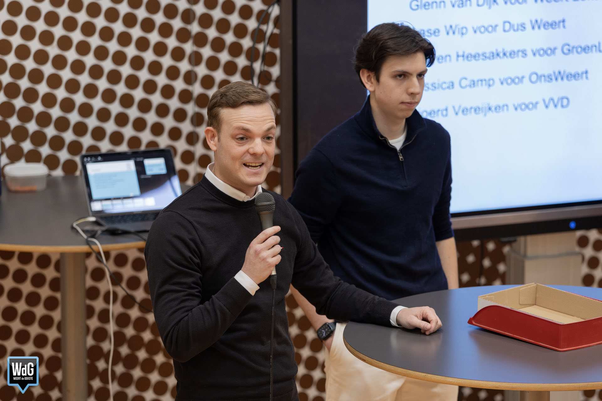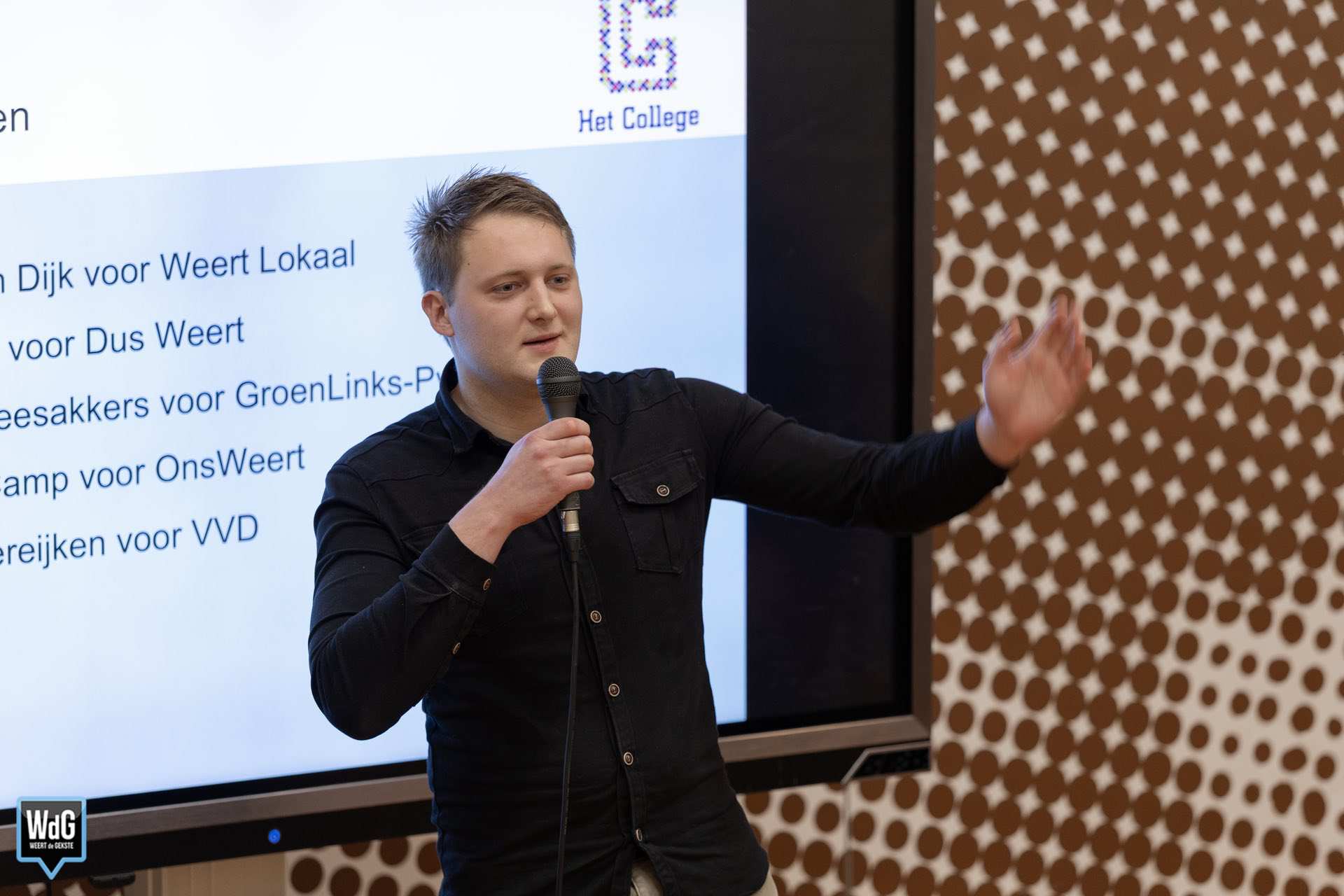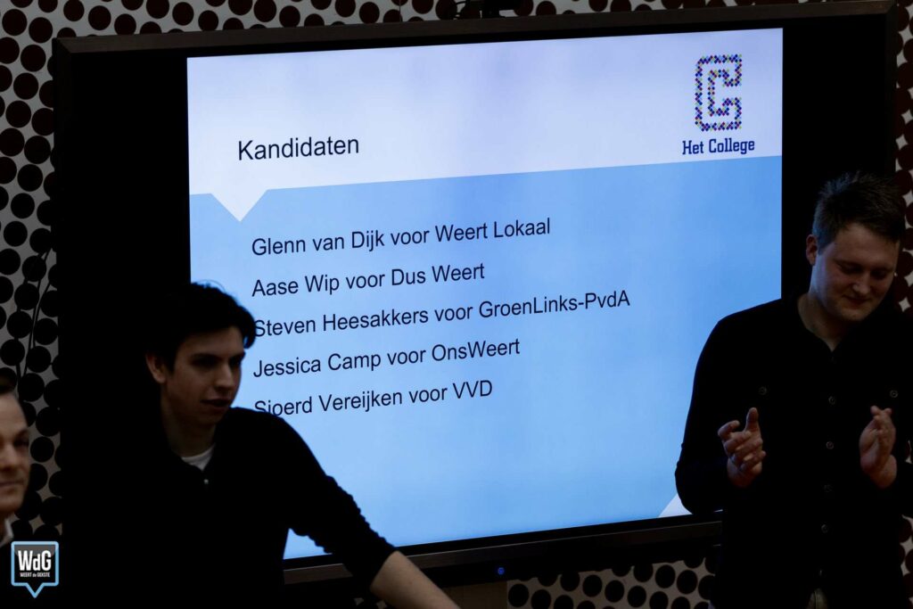 Aan het debat namen Glenn van Dijk (Weert Lokaal), Aase Wip (DUS Weert), Steven Heesakkers (GroenLinks-PvdA), Jessica Camp (OnsWeert) en Sjoerd Vereijken (VVD) deel. De kandidaten vertegenwoordigden hun partijen in een discussie over onder meer wonen, het centrum van Weert, sportvoorzieningen en de toekomst van de stad.