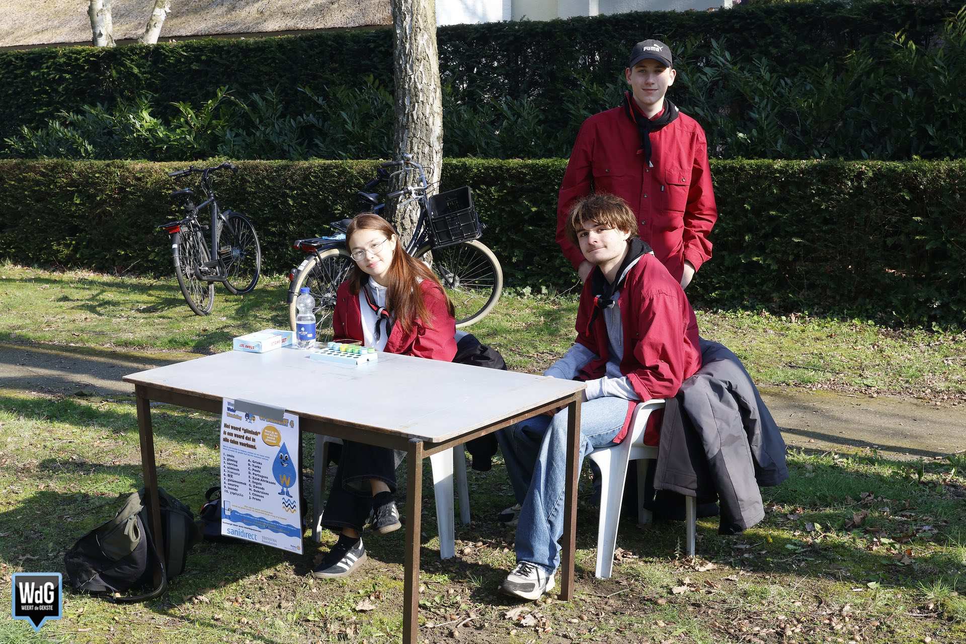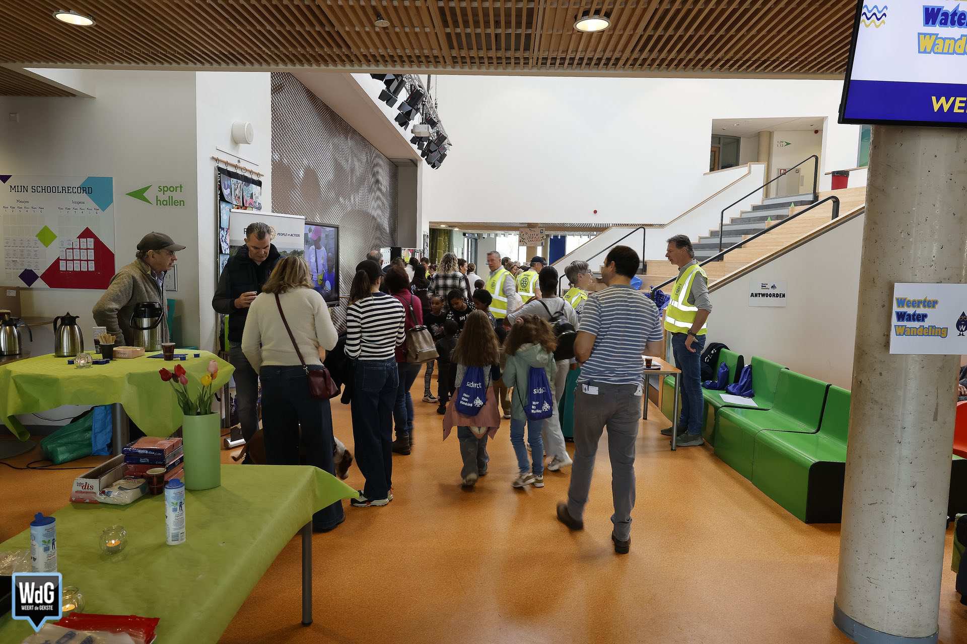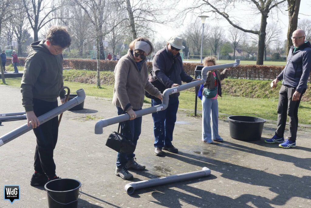 Op Het College werden de wandelaars feestelijk onthaald. Kinderen kwamen trots terug met de antwoorden op puzzelvragen over water, die onderweg waren verspreid. Buiten wachtten leerzame waterspellen, waar volop gebruik van werd gemaakt.