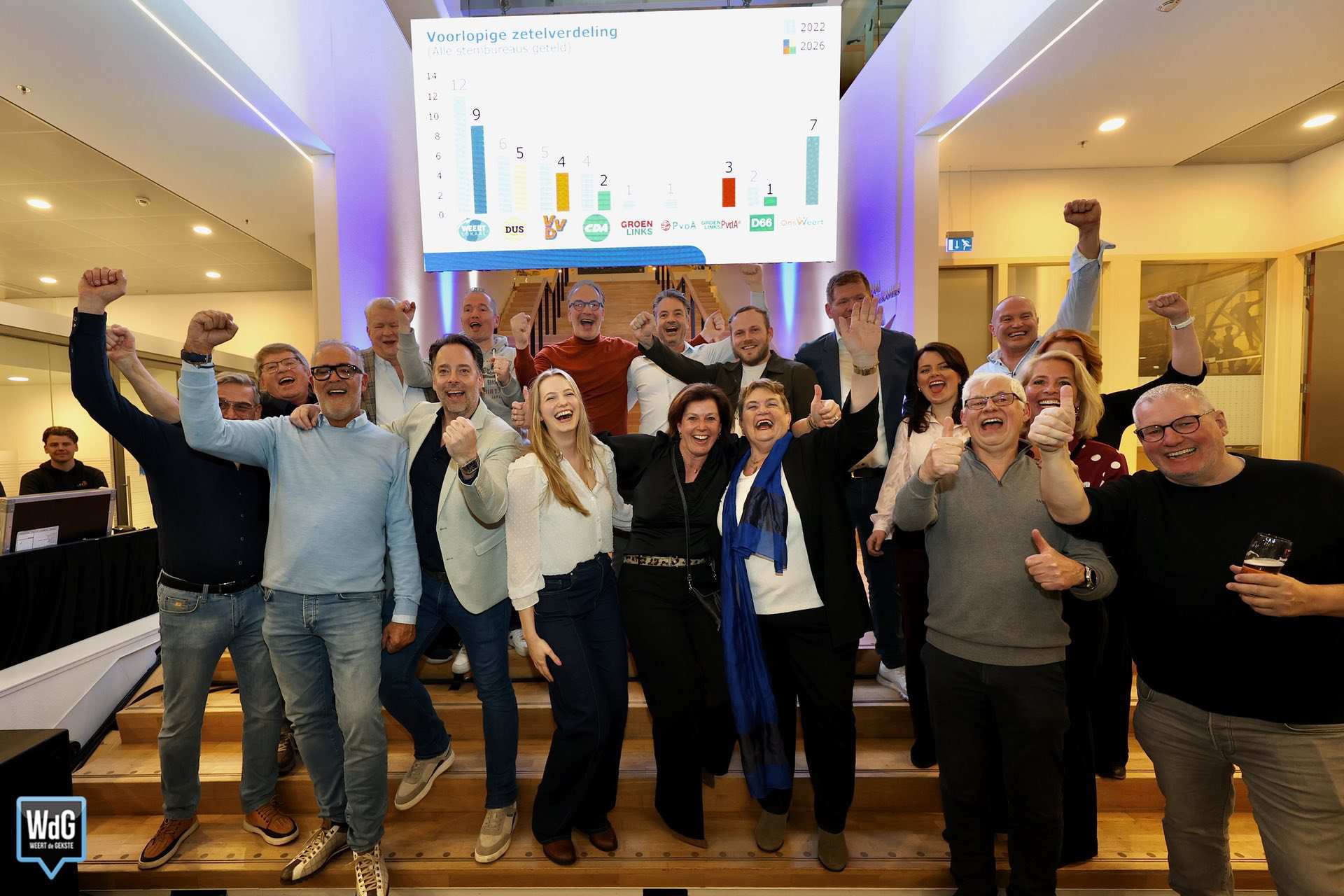 De voorlopige zetelverdeling laat duidelijke verschuivingen zien in de Weerter gemeenteraad. Weert Lokaal blijft met 9 zetels de grootste partij, maar levert in ten opzichte van de 12 zetels in 2022. Ook DUS Weert (van 6 naar 5 zetels), de VVD (van 5 naar 4 zetels) en het CDA (van 4 naar 2 zetels) verliezen zetels.