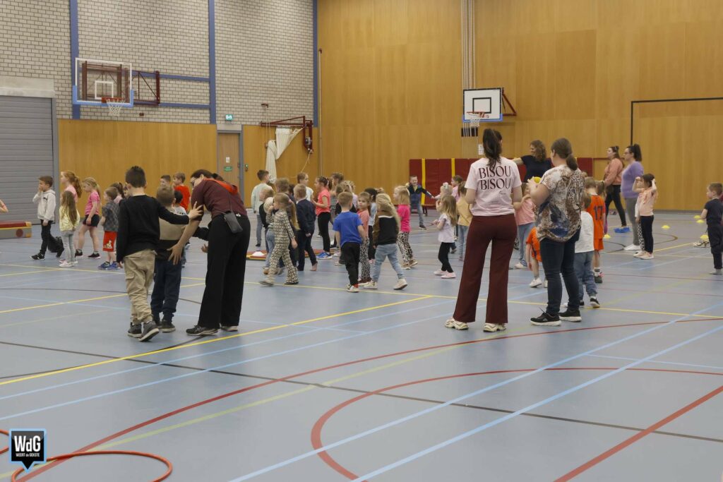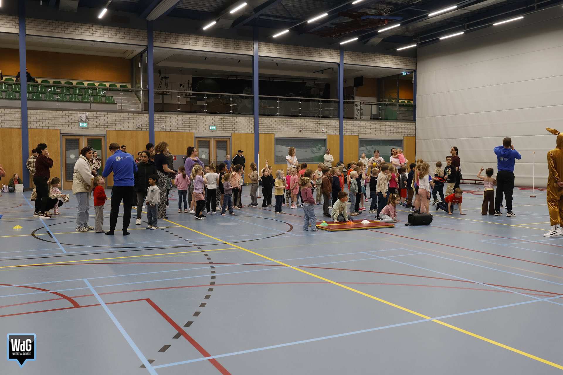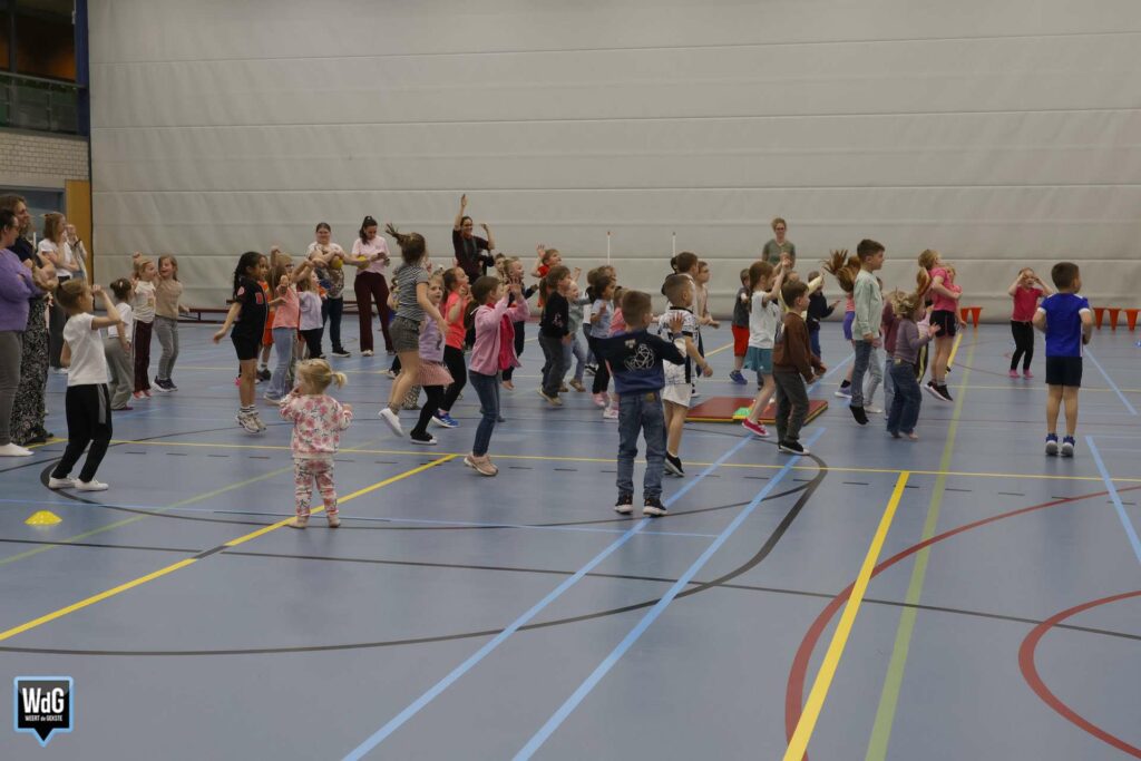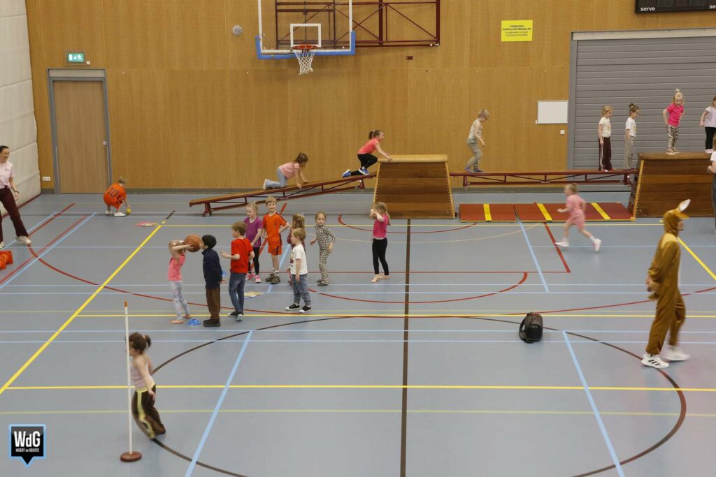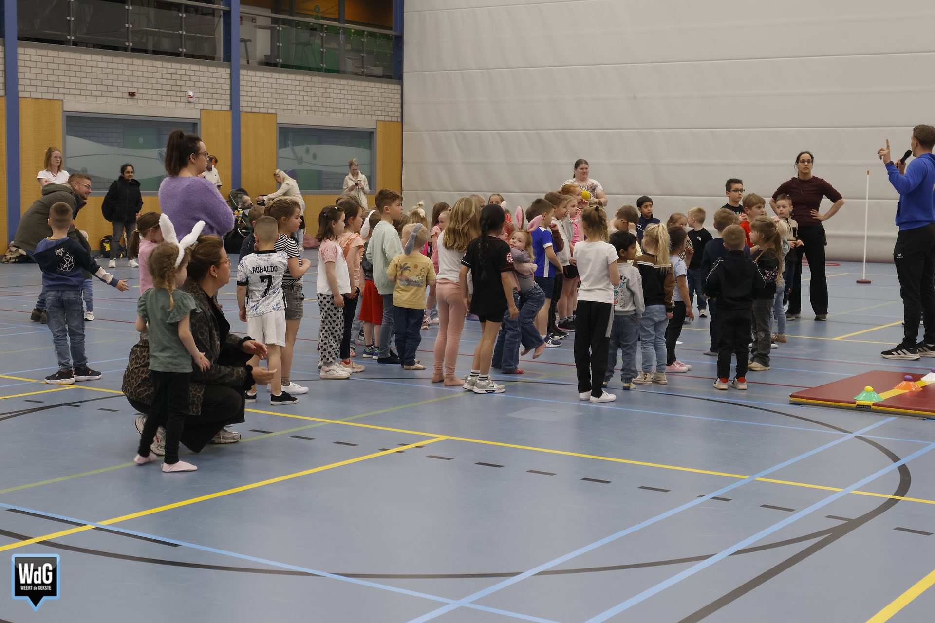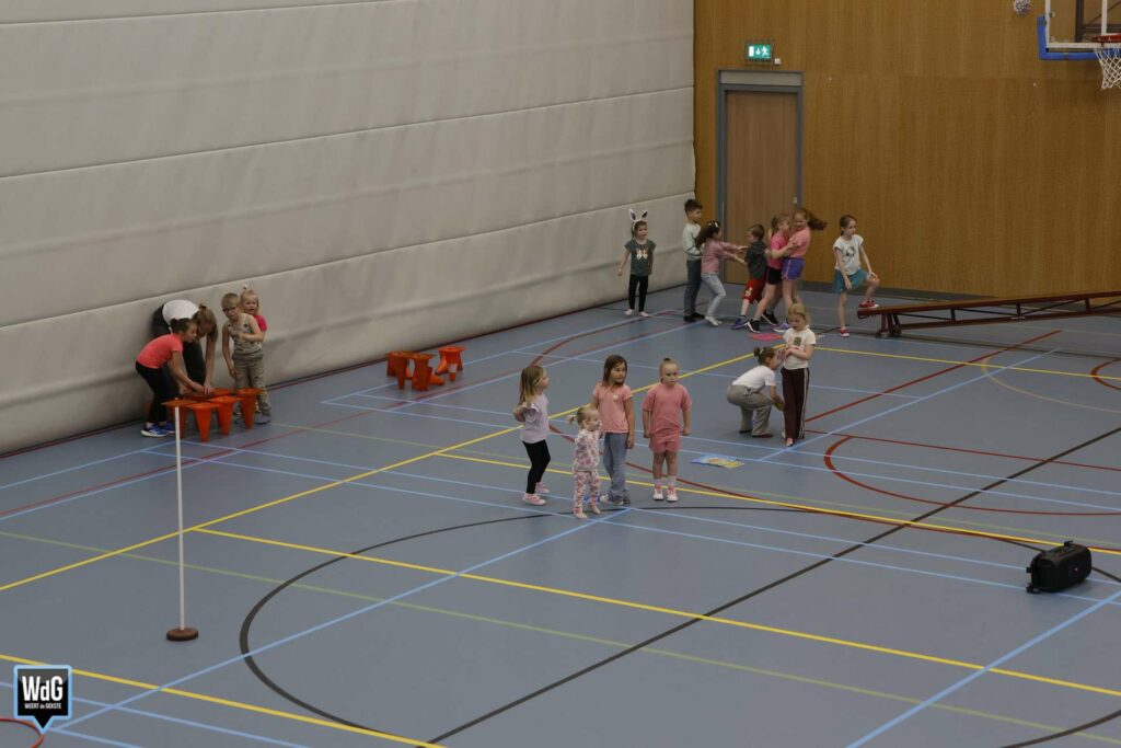 Ondertussen genoten ouders, broertjes en zusjes zichtbaar langs de kant. Vanaf de tribune en de zijkant van de zaal moedigden zij de kinderen enthousiast aan. Daarnaast waren meerdere kinderen verkleed als paashaas, wat zorgde voor een extra feestelijke sfeer.