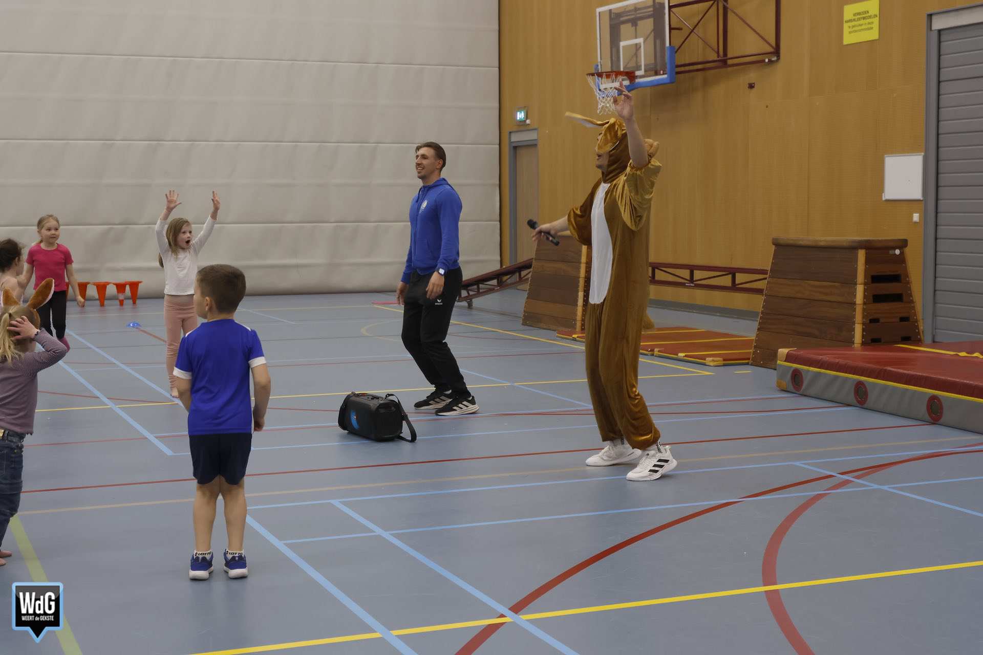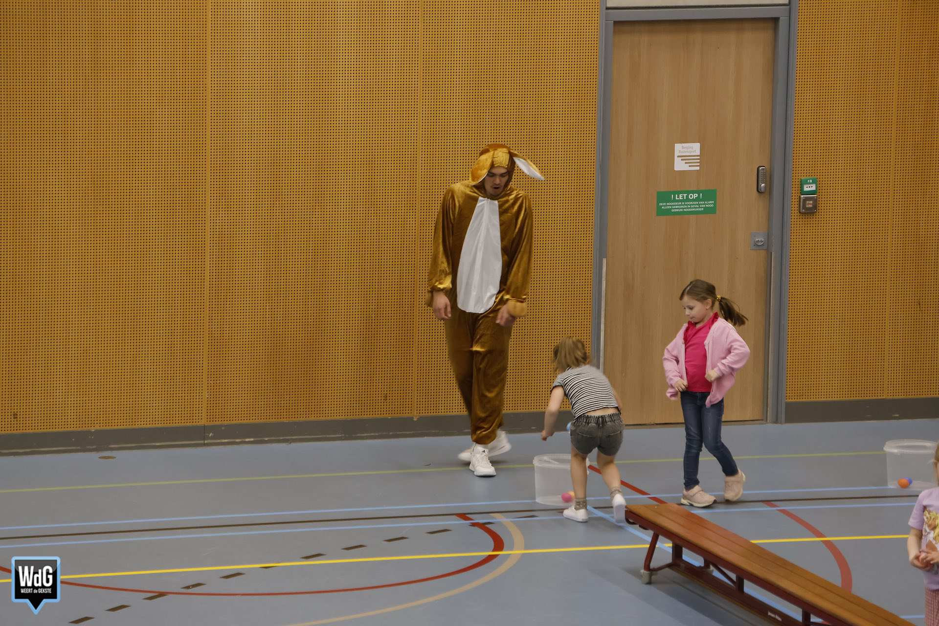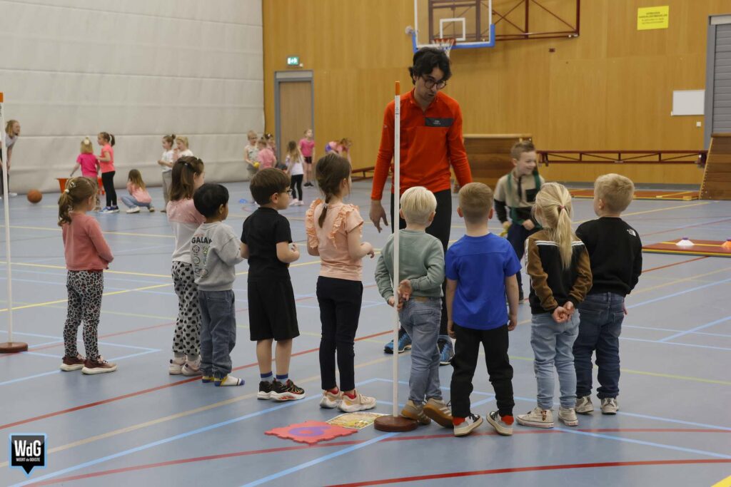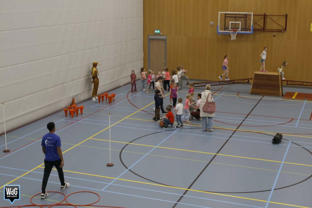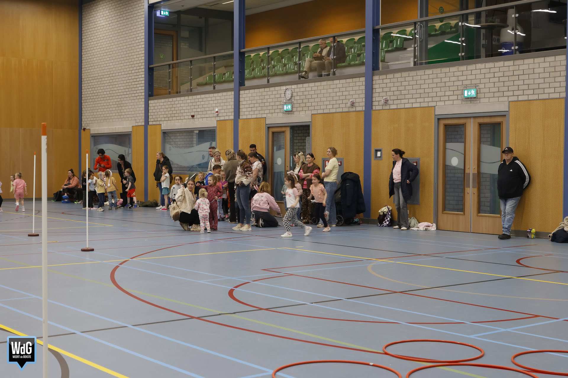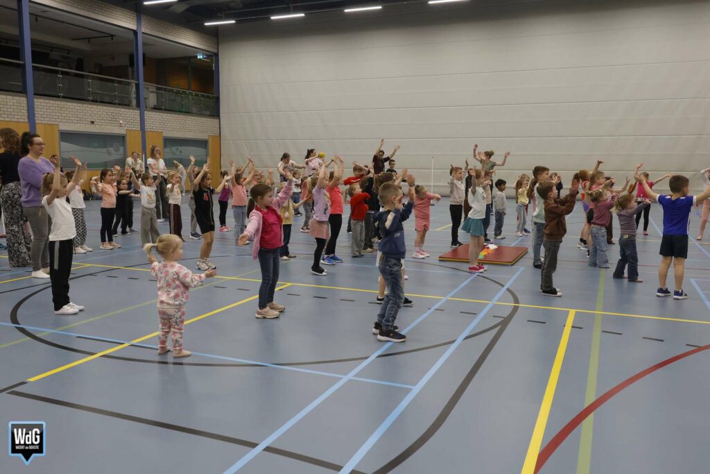 Ondertussen genoten ouders, broertjes en zusjes zichtbaar langs de kant. Vanaf de tribune en de zijkant van de zaal moedigden zij de kinderen enthousiast aan. Daarnaast waren meerdere kinderen verkleed als paashaas, wat zorgde voor een extra feestelijke sfeer.