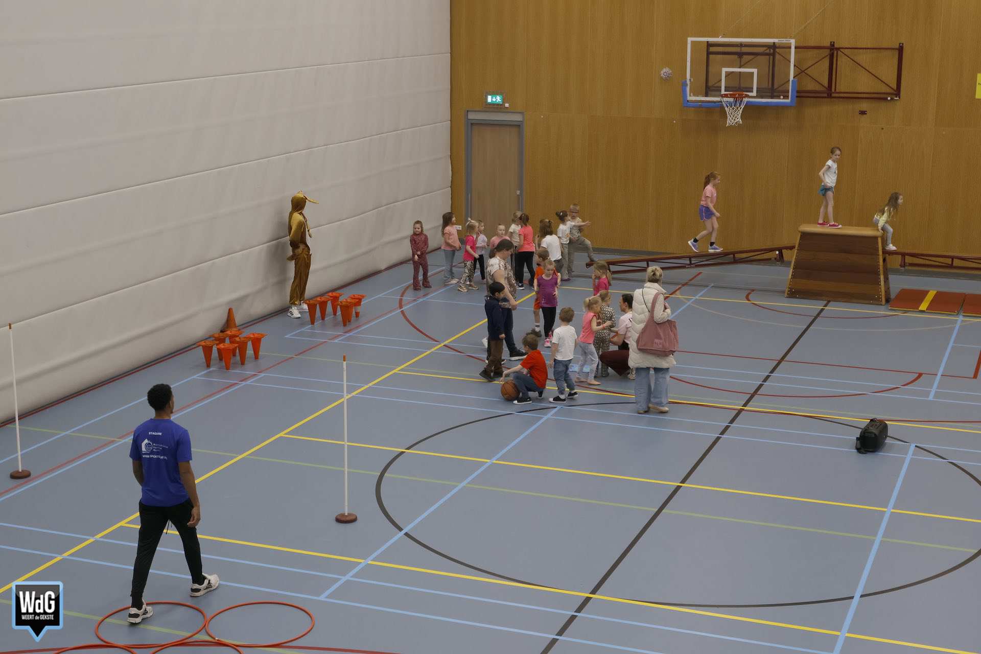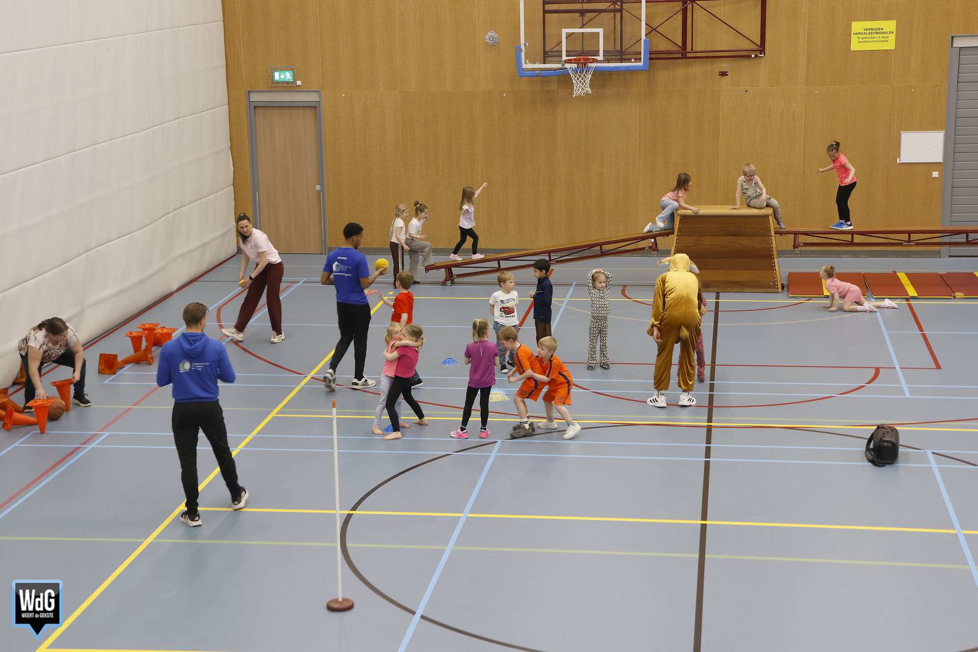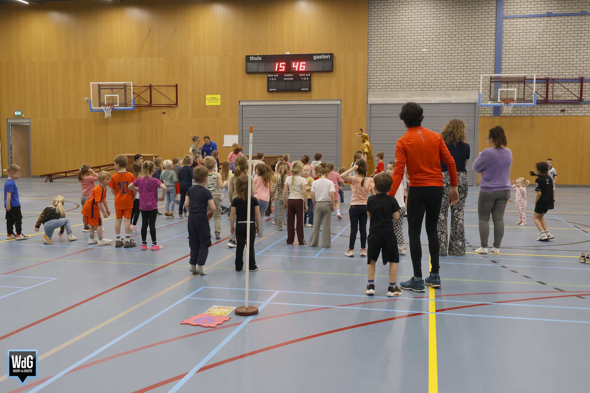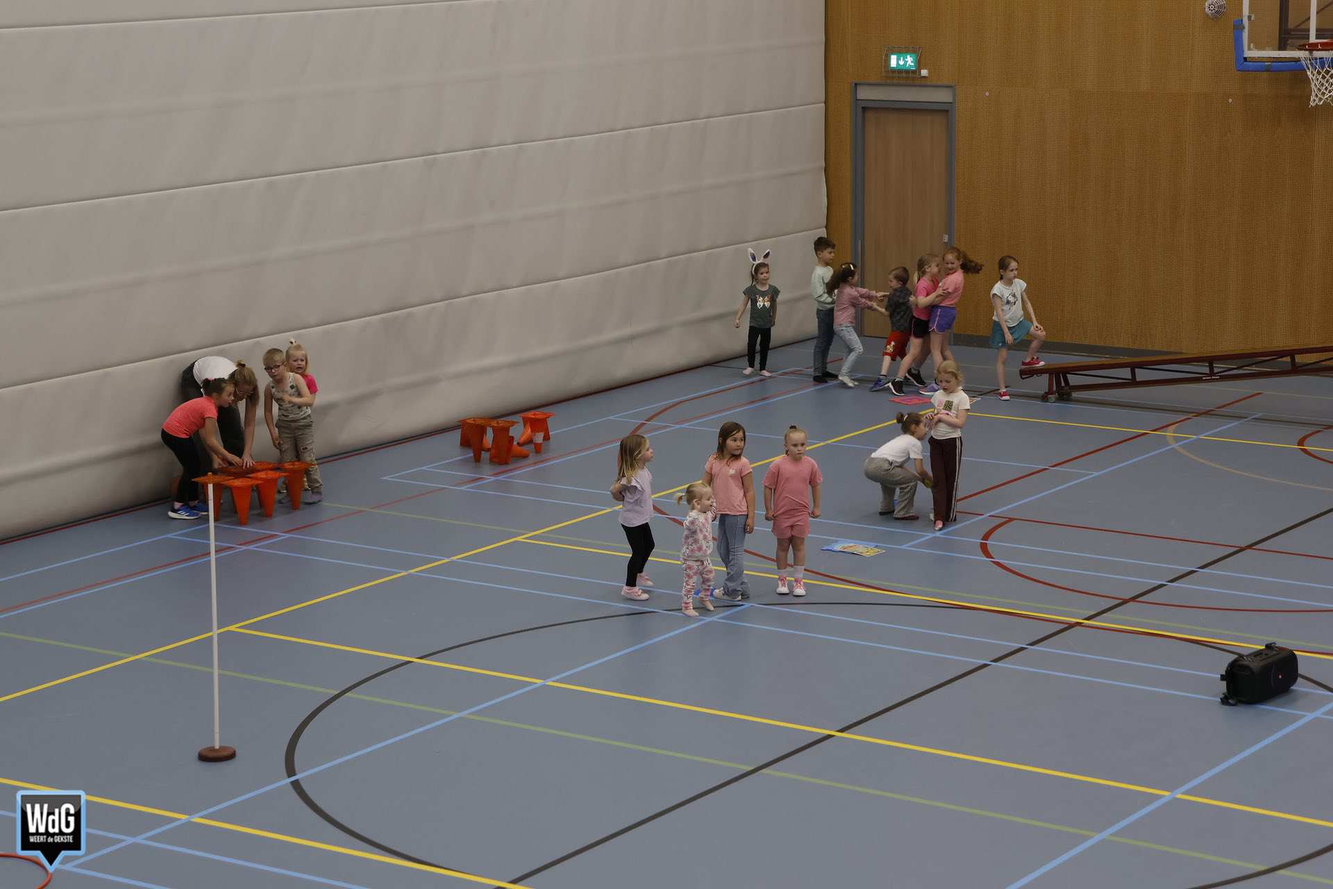 Ondertussen genoten ouders, broertjes en zusjes zichtbaar langs de kant. Vanaf de tribune en de zijkant van de zaal moedigden zij de kinderen enthousiast aan. Daarnaast waren meerdere kinderen verkleed als paashaas, wat zorgde voor een extra feestelijke sfeer.
