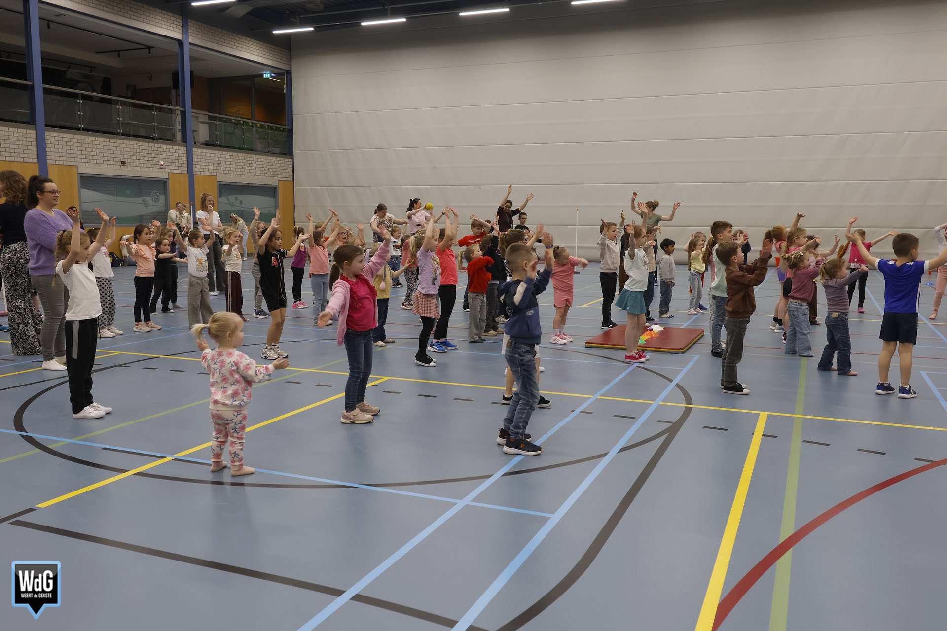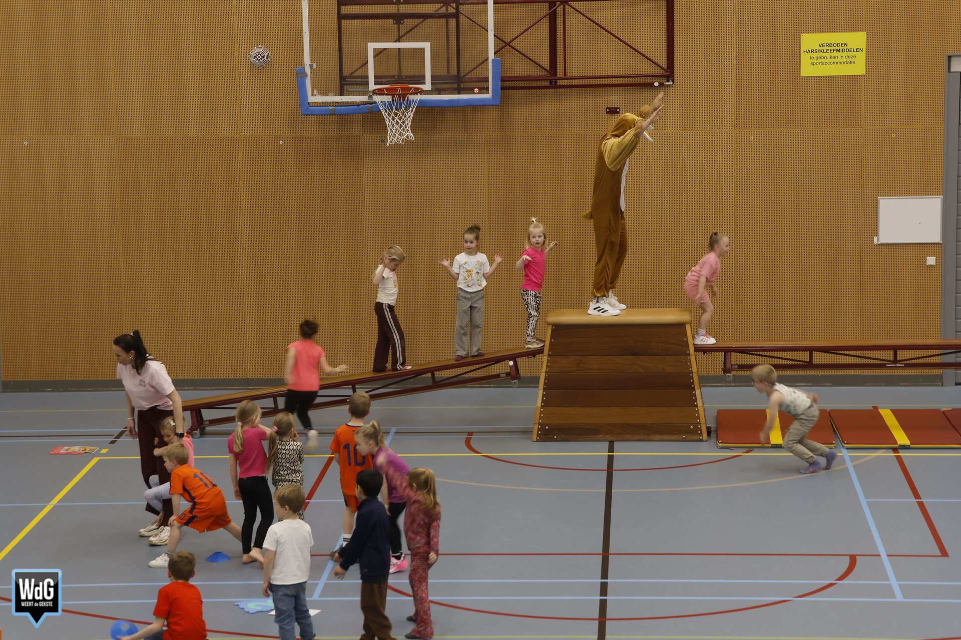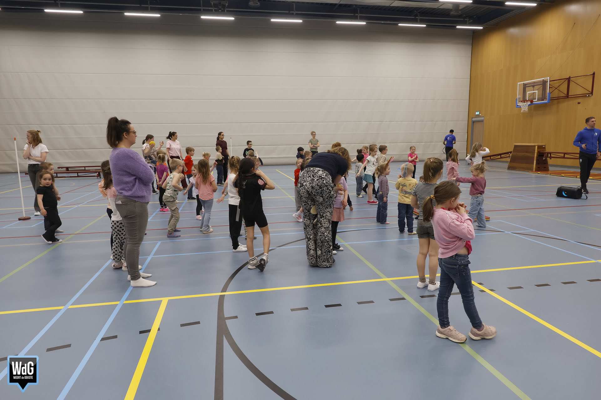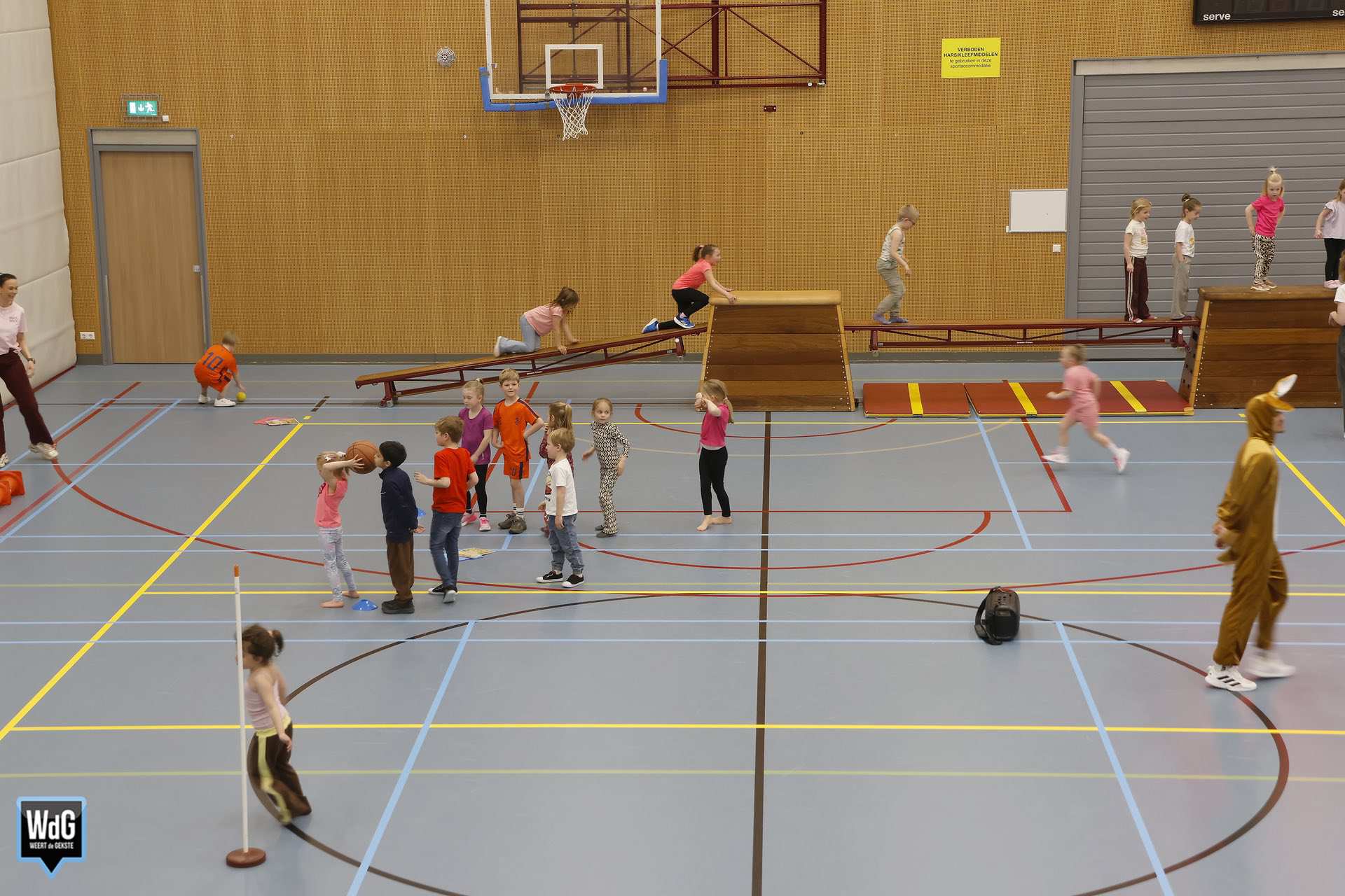 Ondertussen genoten ouders, broertjes en zusjes zichtbaar langs de kant. Vanaf de tribune en de zijkant van de zaal moedigden zij de kinderen enthousiast aan. Daarnaast waren meerdere kinderen verkleed als paashaas, wat zorgde voor een extra feestelijke sfeer.