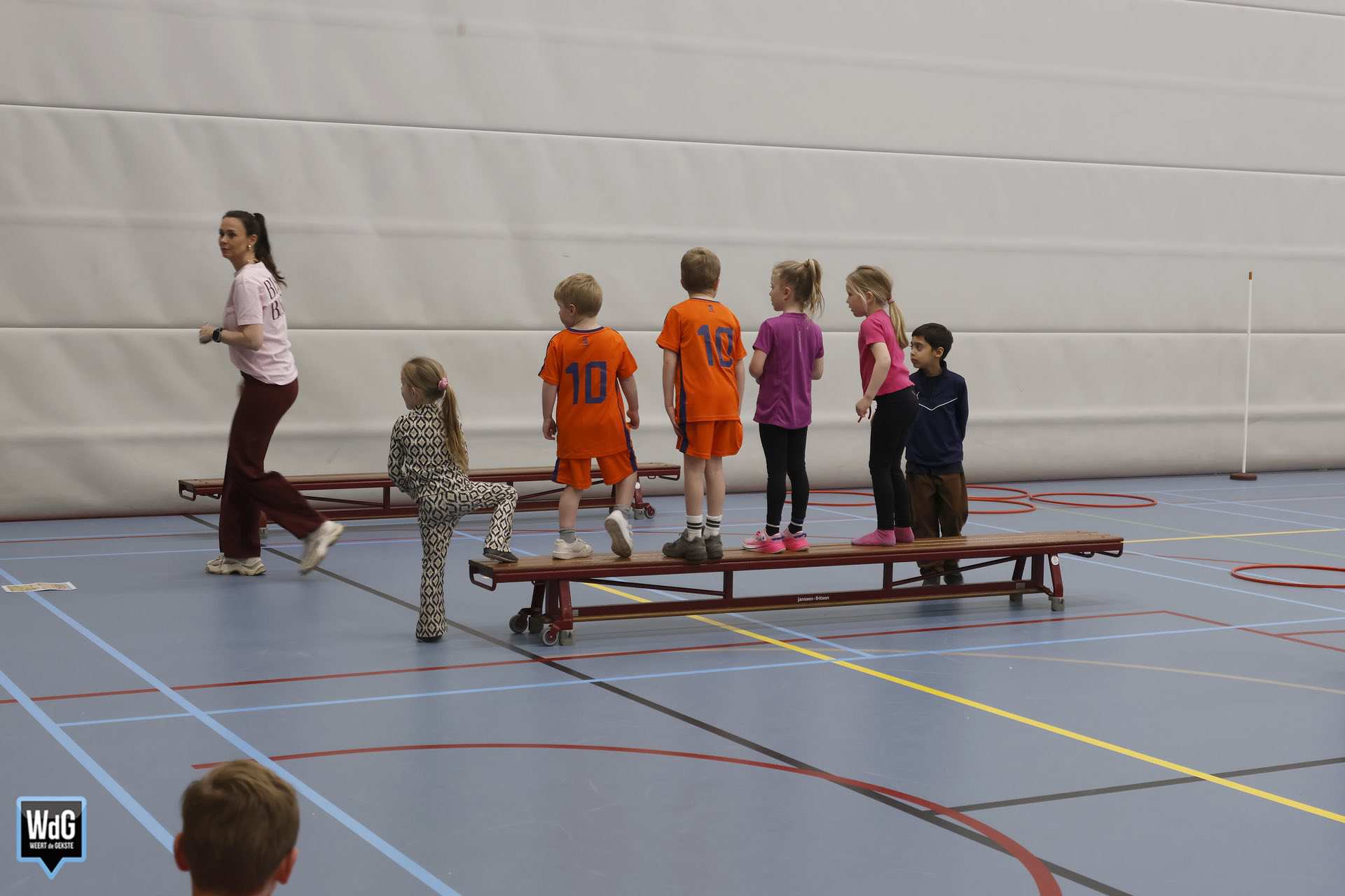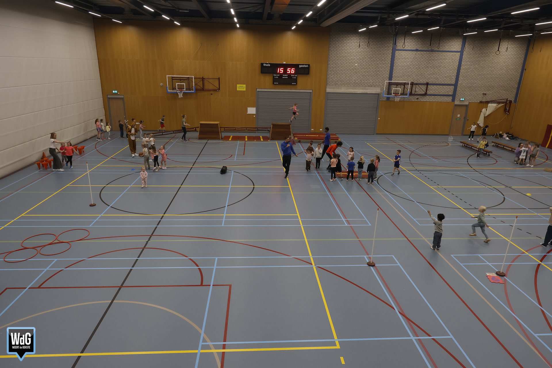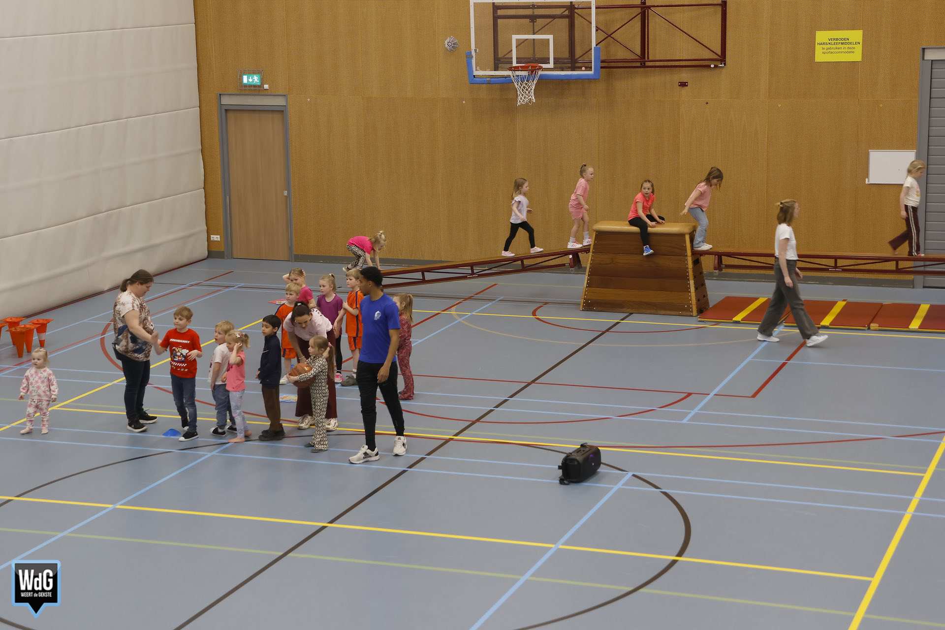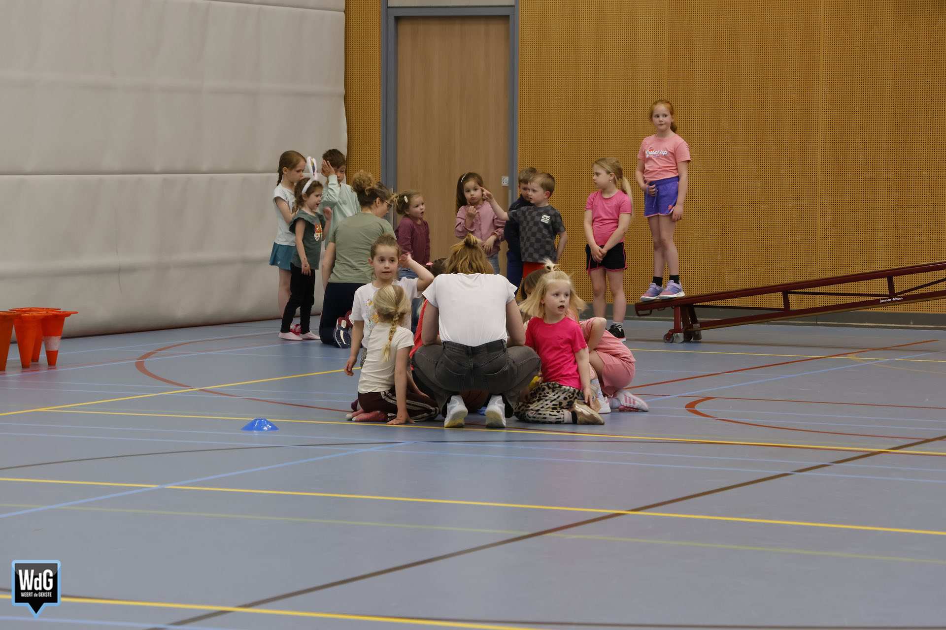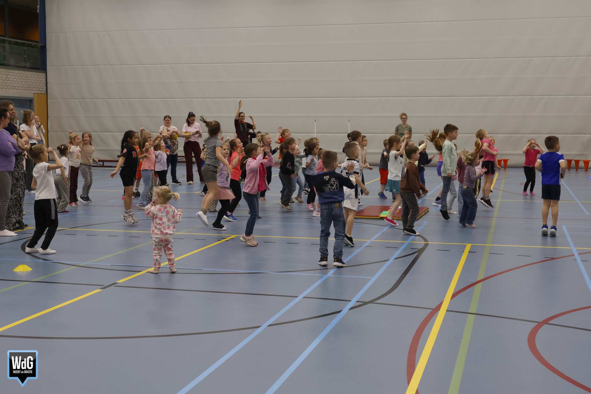 Ondertussen genoten ouders, broertjes en zusjes zichtbaar langs de kant. Vanaf de tribune en de zijkant van de zaal moedigden zij de kinderen enthousiast aan. Daarnaast waren meerdere kinderen verkleed als paashaas, wat zorgde voor een extra feestelijke sfeer.