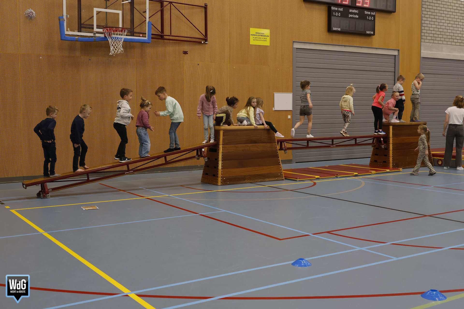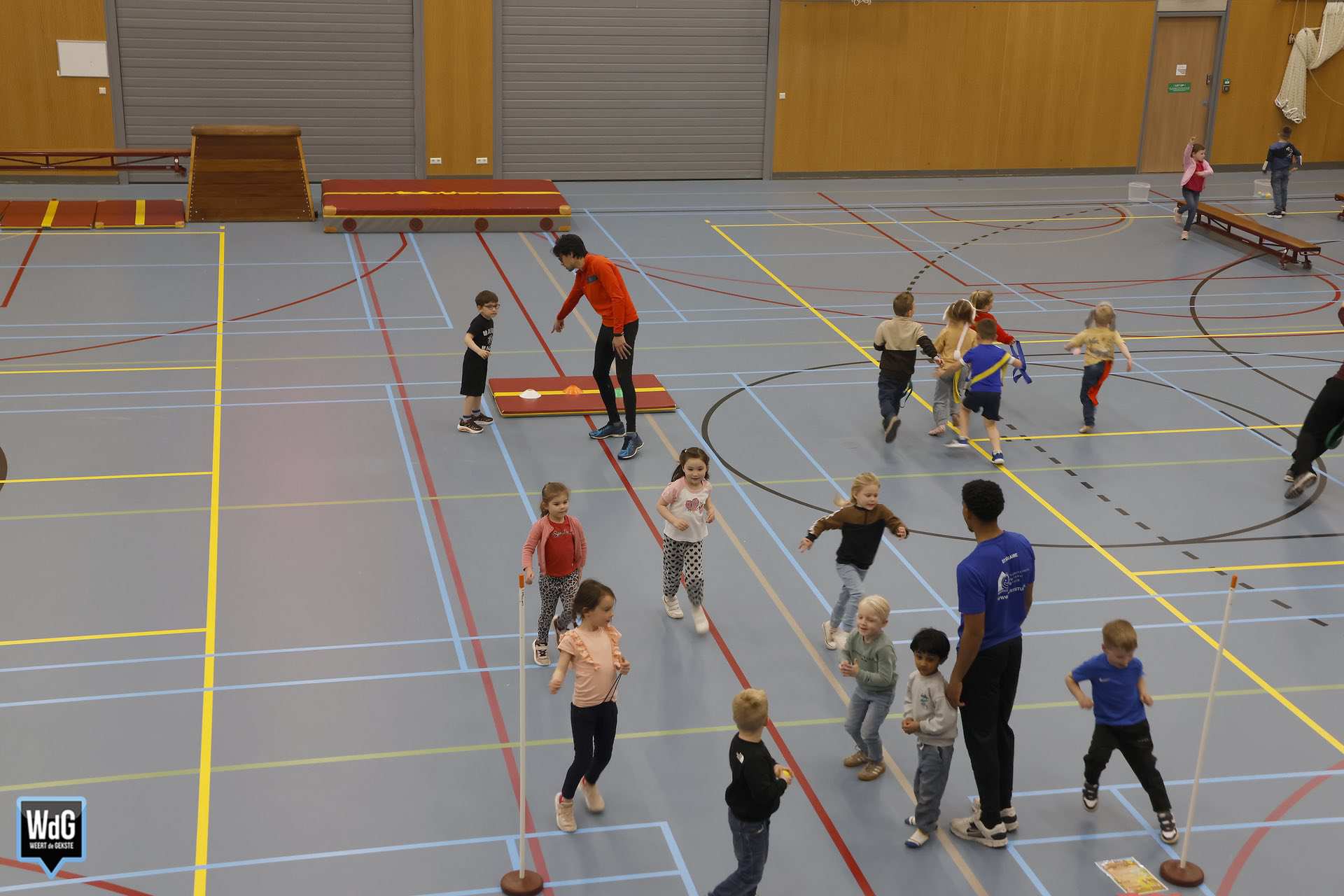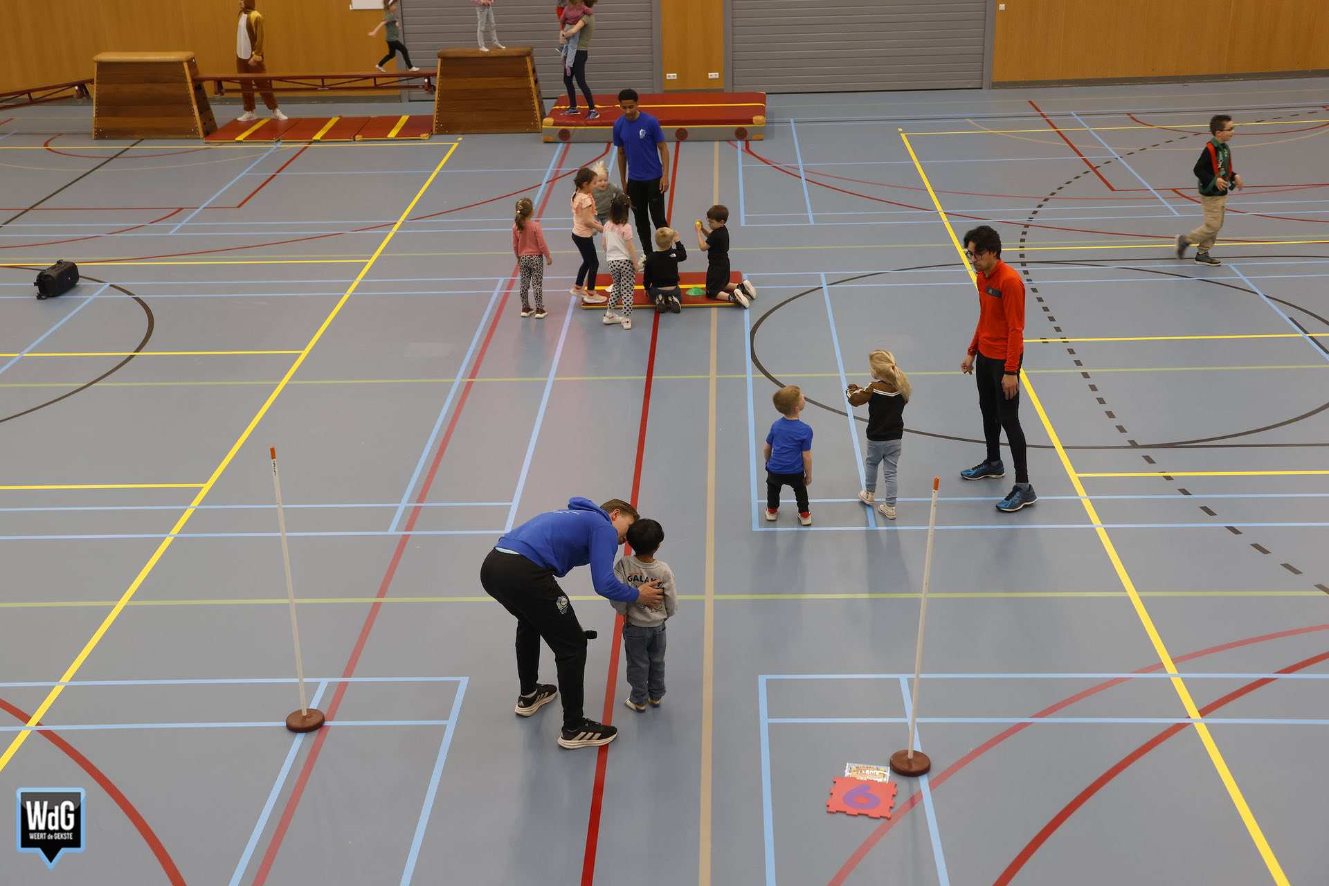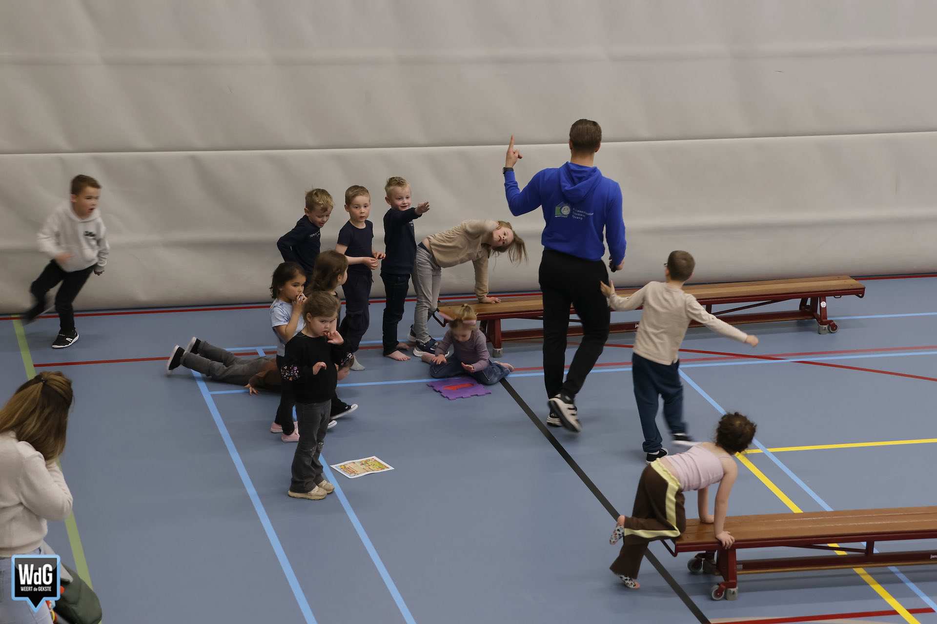 Ondertussen genoten ouders, broertjes en zusjes zichtbaar langs de kant. Vanaf de tribune en de zijkant van de zaal moedigden zij de kinderen enthousiast aan. Daarnaast waren meerdere kinderen verkleed als paashaas, wat zorgde voor een extra feestelijke sfeer.