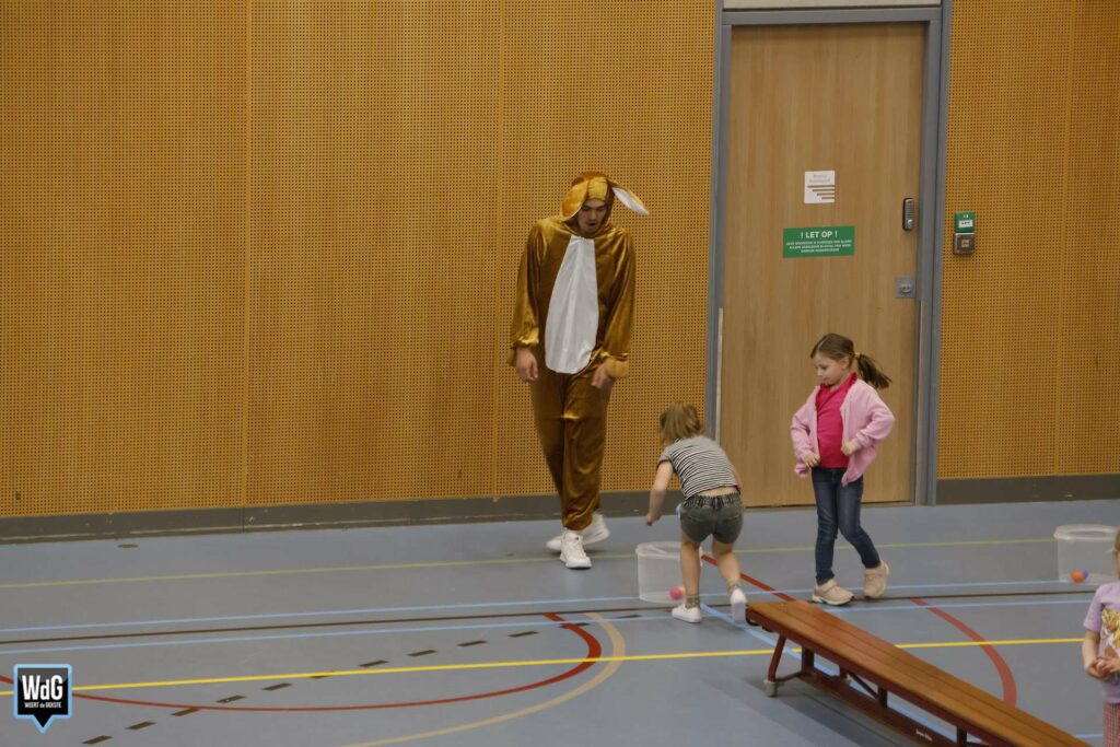 Een van de hoogtepunten was de komst van de Paashaas. Tot grote vreugde van de kinderen kwam hij langs én deed hij actief mee. Eerst vroegen kinderen nieuwsgierig of hij écht de Paashaas was, daarna betrokken zij hem enthousiast bij het spel. Bovendien verzorgde hij de warming-up, waardoor alle kinderen meteen fanatiek meededen.