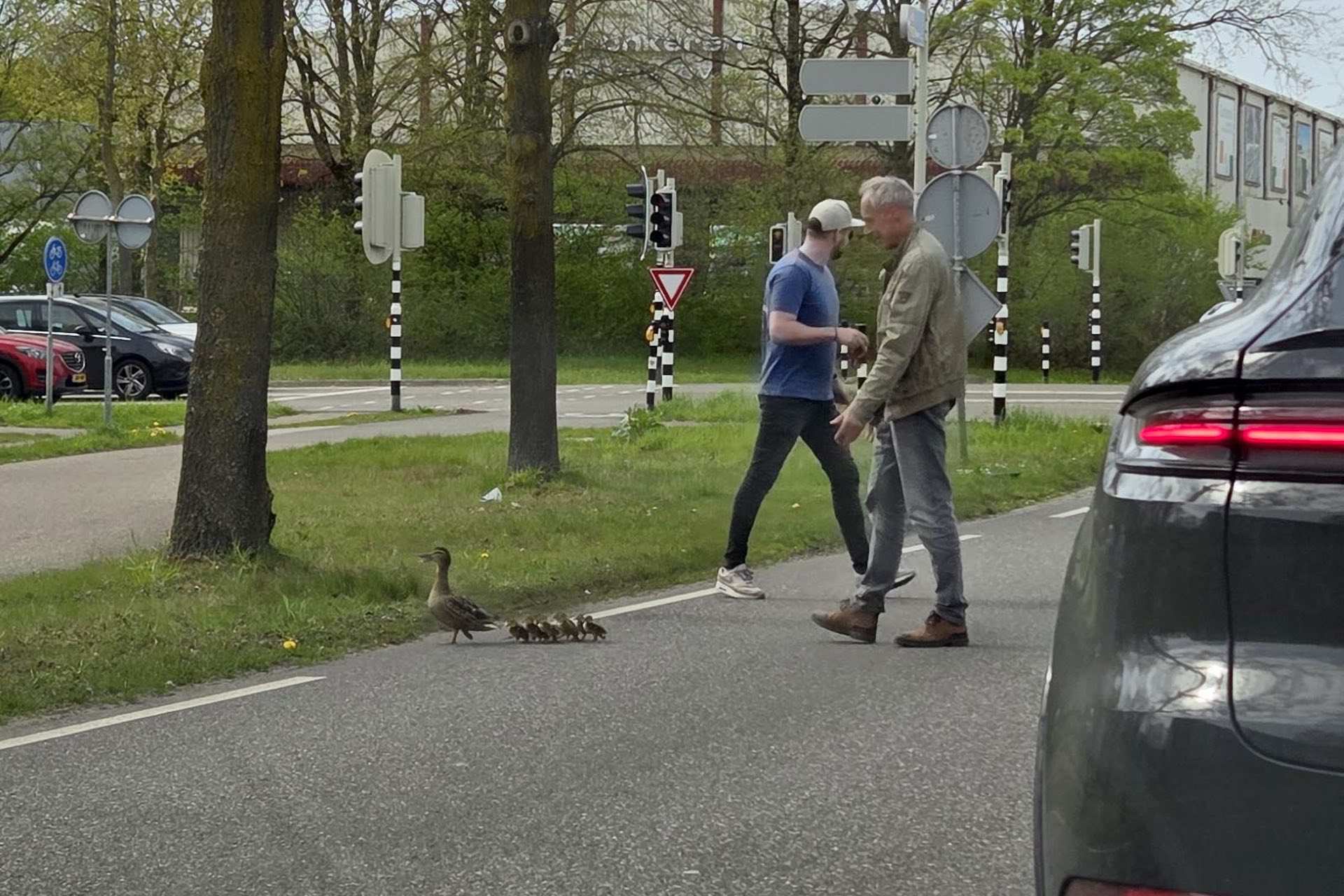 Toch kwam er hulp uit onverwachte hoek. Twee mannen besloten in te grijpen en hielpen de eendjes veilig naar de overkant. Dankzij hun inzet bereikte het hele gezelschap uiteindelijk ongedeerd de overzijde van de weg.