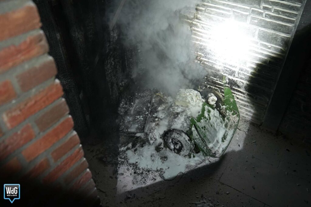 Bij de poort van een tuin stond een afvalcontainer in brand. Een buurtbewoner merkte het vuur op en sloeg direct alarm. Vervolgens probeerde hij samen met een andere buurtbewoner de brand onder controle te krijgen met een brandblusser.
