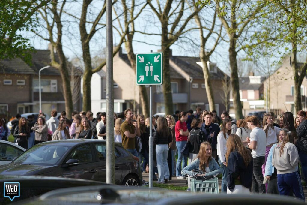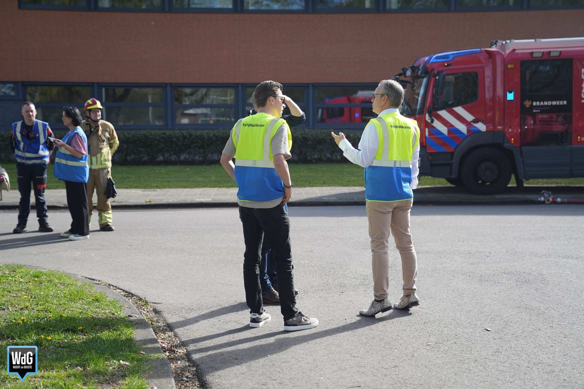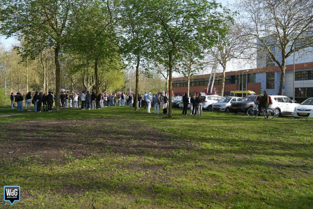 De oefening duurde in totaal ongeveer een uur. Voor de studenten betekende dat even wachten buiten, maar met het aangename lenteweer en zicht op de inzet van hulpdiensten was dat zeker geen straf.