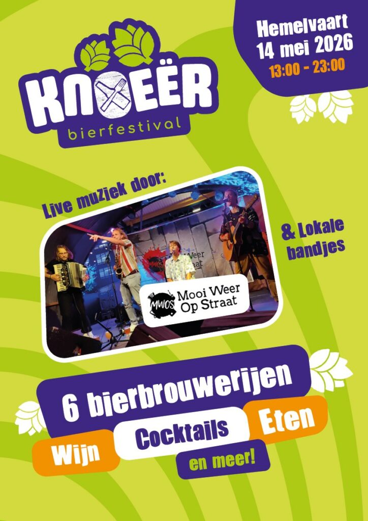 Winactie – Op Hemelvaartsdag, 14 mei 2026, maakt Weert zich op voor een nieuw evenement in de binnenstad. In de Slachterijstraat en op het terras van Proeflokaal de Weerter Stadsbrouwerij vindt dan voor het eerst het Knoeër Bierfestival plaats. De organisatie zet in op een compleet festivalconcept, waarbij niet alleen bier centraal staat, maar ook eten, muziek en gezelligheid.